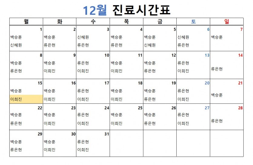 반월당 잘보는 한의원 2025년 12월 원장님 진료표입니다^^